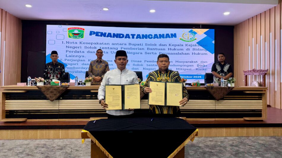 Memorandum of Understanding (MoU) atau nota kesepahaman, antara Pemerintah Kabupaten Solok dan Kejaksaan Negeri Solok di Aula Gedung C, Setda Kabupaten Solok di Arosuka, pada Jumat (3/10/2025).