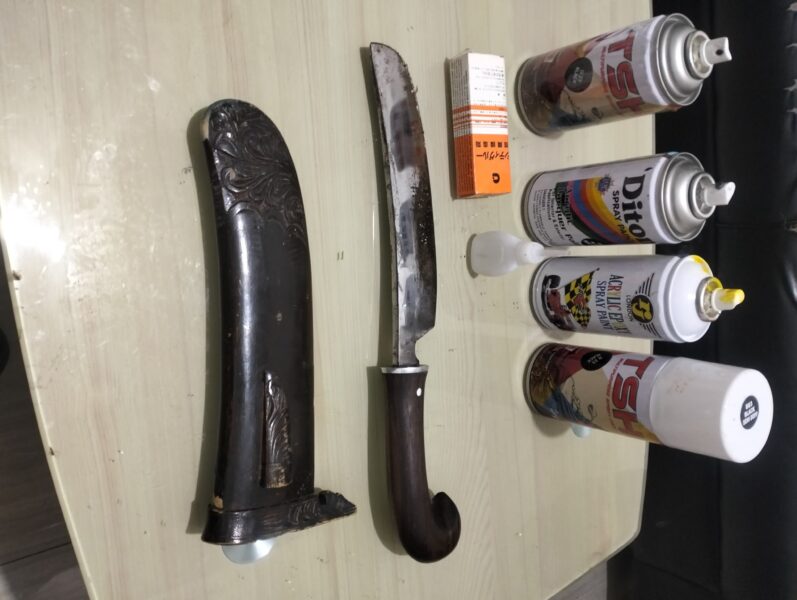 Dalam penangkapan tersebut, Unit Reskrim Polsek Benda mengamankan barang bukti berupa satu unit Mitsubishi Colt Diesel tahun 2007, sebilah golok yang digunakan saat beraksi, pelat nomor asli dan palsu, enam kaleng pilox, serta lem perekat pelat nomor.