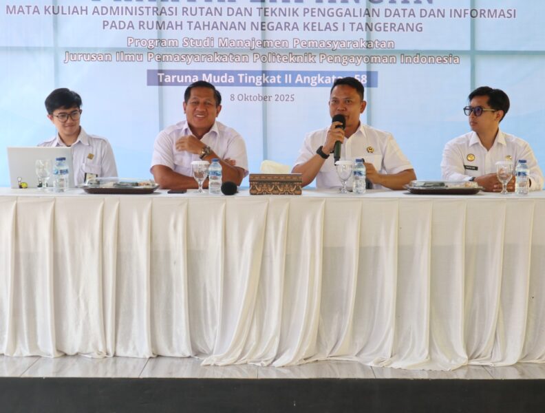 TANGERANG, HaluanNews.co.id – Rutan Kelas I Tangerang menerima kunjungan dari Taruna Politeknik Pengayoman Indonesia (Poltekpin) Tingkat II Angkatan 58 dalam rangka pelaksanaan kegiatan praktik lapangan mata kuliah Administrasi Rutan dan Teknik Penggalian Data dan Informasi (08/10). Kegiatan ini diikuti oleh 105 orang taruna yang didampingi oleh dua orang pembina dan tiga orang dosen. Rombongan diterima langsung oleh Pelaksana Harian (Plh.) Kepala Rutan Kelas I Tangerang, Ezet Muttaqin, bersama jajaran pejabat struktural di Aula Saharjo Rutan Kelas I Tangerang.